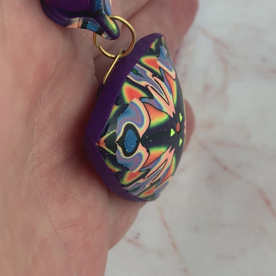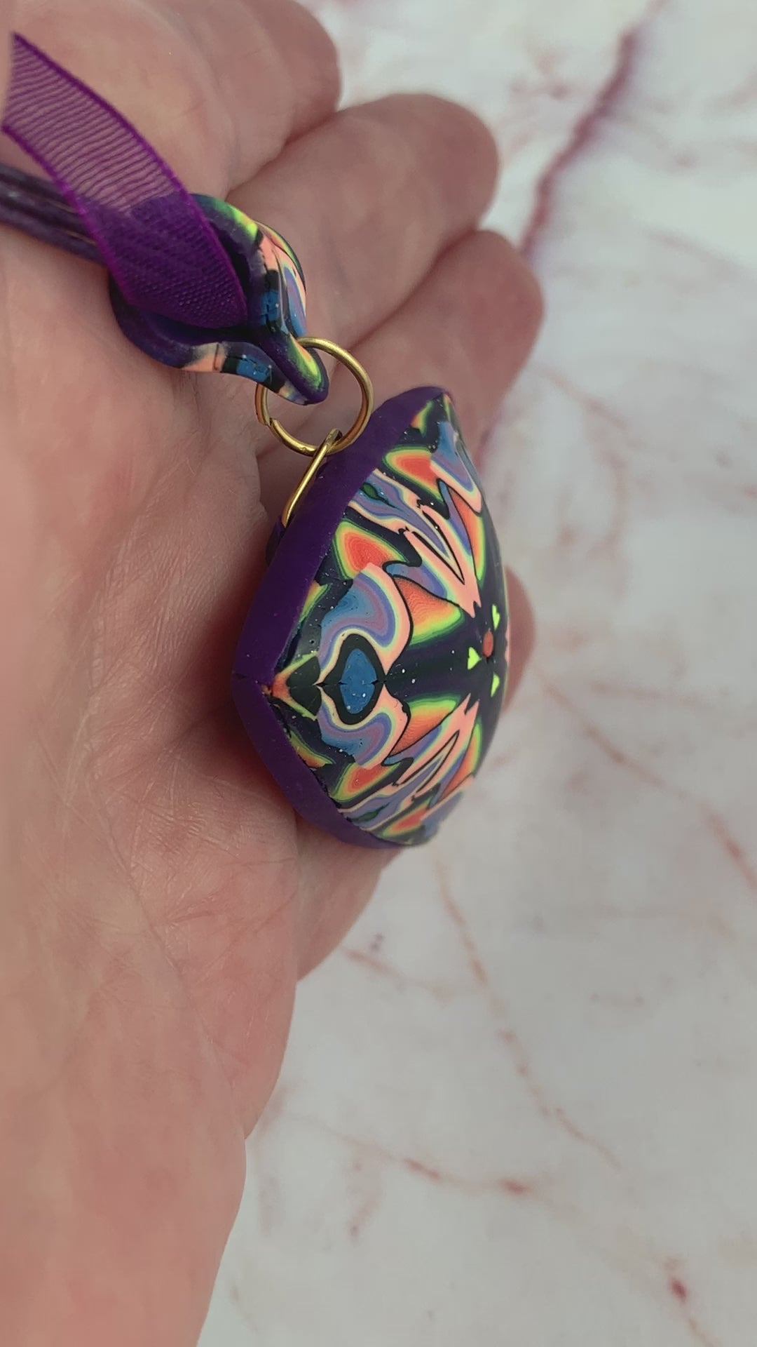 This piece is had made by combining and reshaping layers of coloured polymer clay into unique designs, cutting and rearranging small slices and then shaping by trapping air between layers.